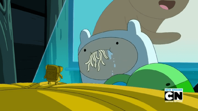 Perhaps that’s the heavy biz running through Jake’s mind, when Finn walks into the kitchen to find his bro pensively and tearfully eating a can of chili.