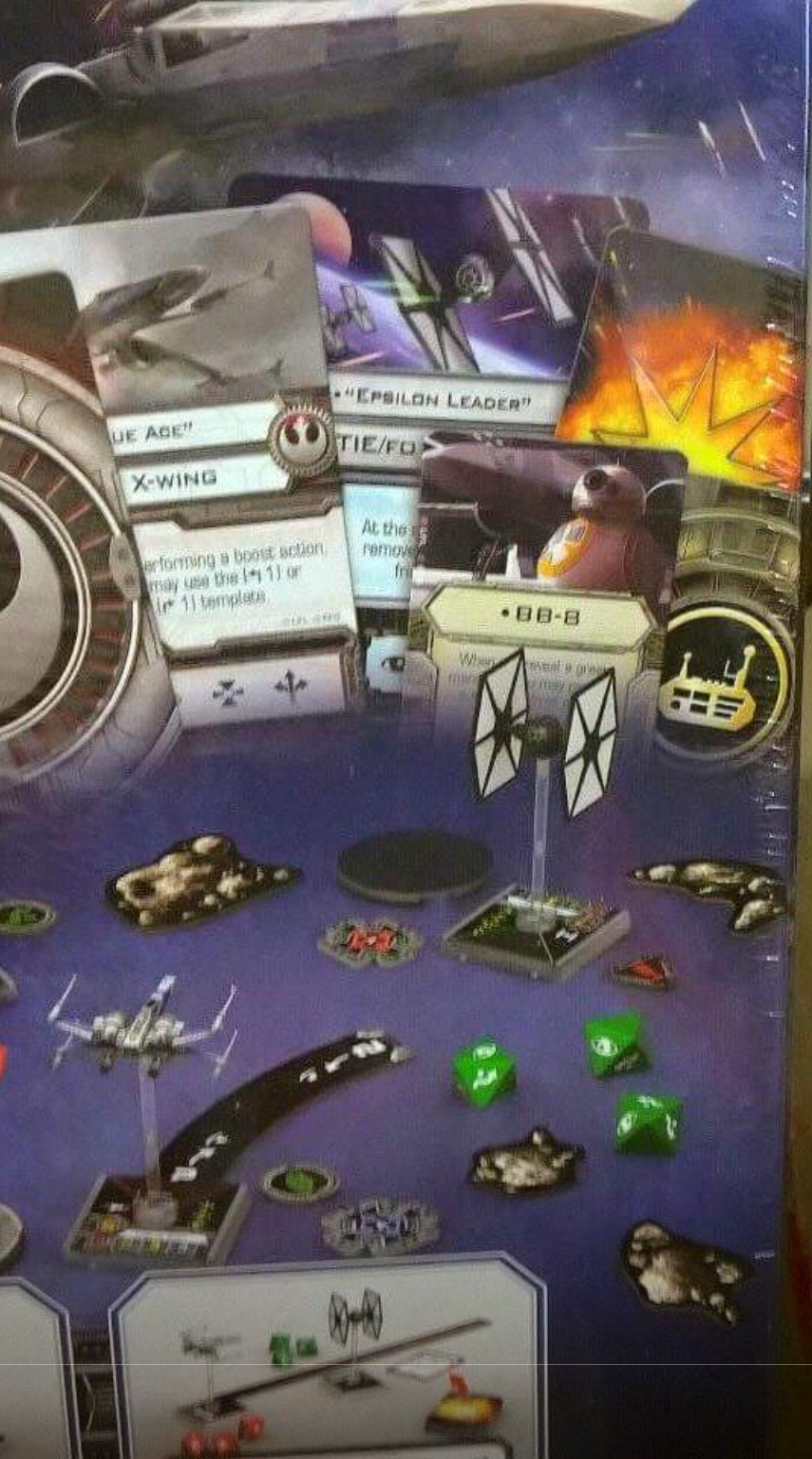 You’ll notice a card that you can partially see of an X-Wing called “- ue Ace.” There are only two possible words it could be, “Blue” or “Rogue.” It’s more likely it’ll be blue, but we’d love to hold out hope that Rogue Squadron has lived on all these years.